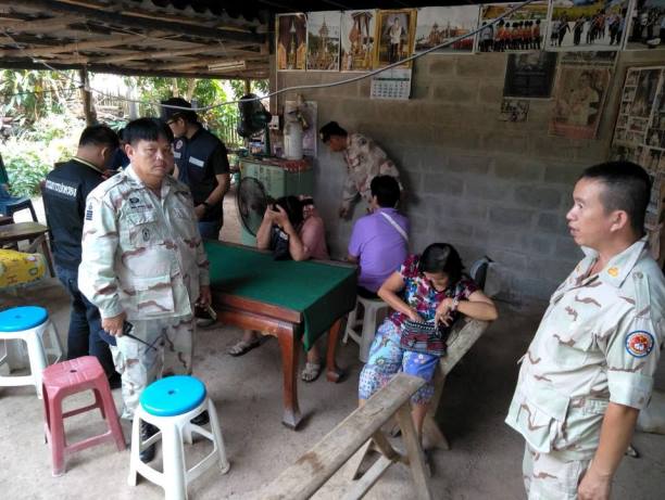 กำลังวิ่งหลบหนีและได้จับกุมผู้ต้องหาได้ 5 ราย (ชาย 1 คน และหญิง 4 คน) พร้อมของกลางที่ใช้ในการเล่นการพนัน (ไพ่ผสมสิบ) ดังนี้.-